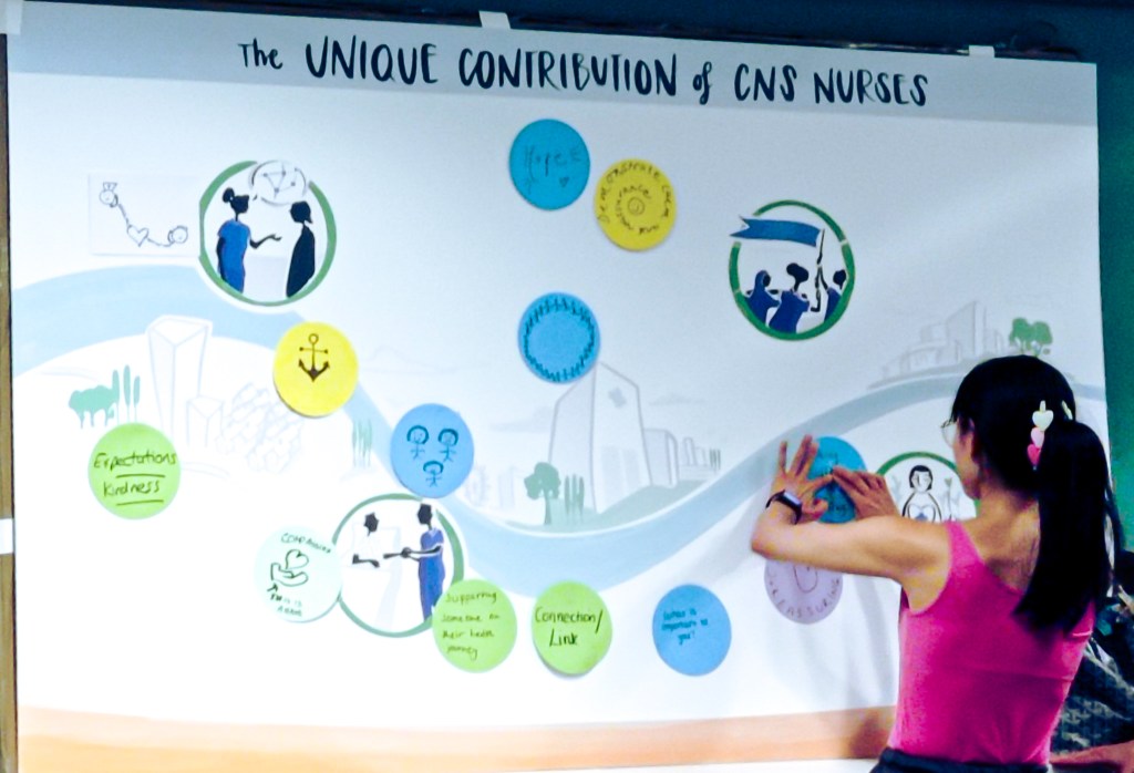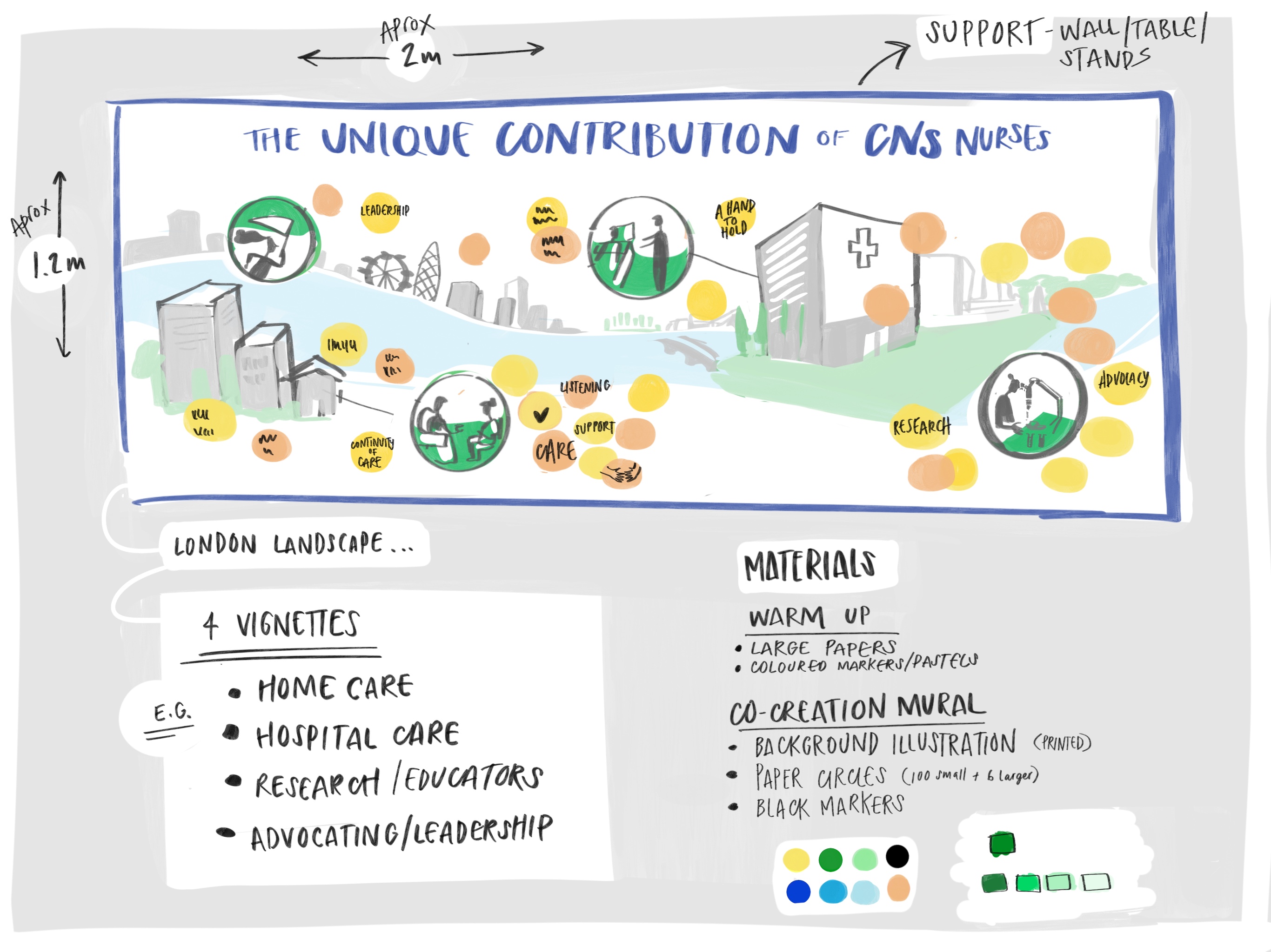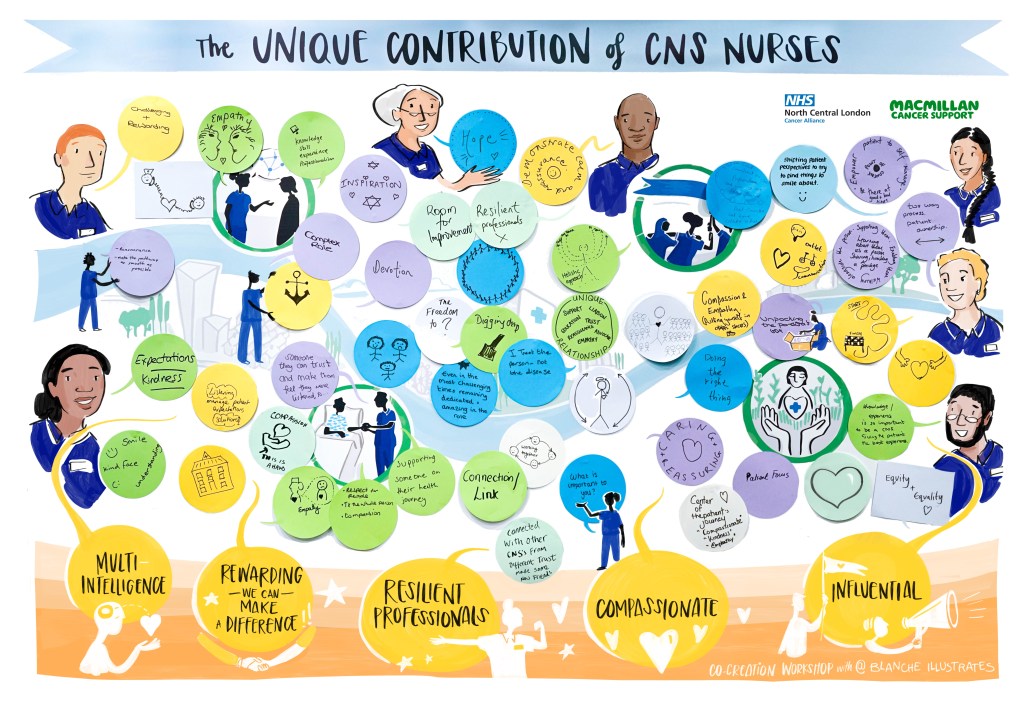 After the event, I turned the mural into a vibrant illustration, to represent their community and amplify their insights. This final Rich Picture, a testament to their dedication and resilience, was shared across the UK, amplifying the voices of CNS Cancer Nurses and celebrating their invaluable contributions.