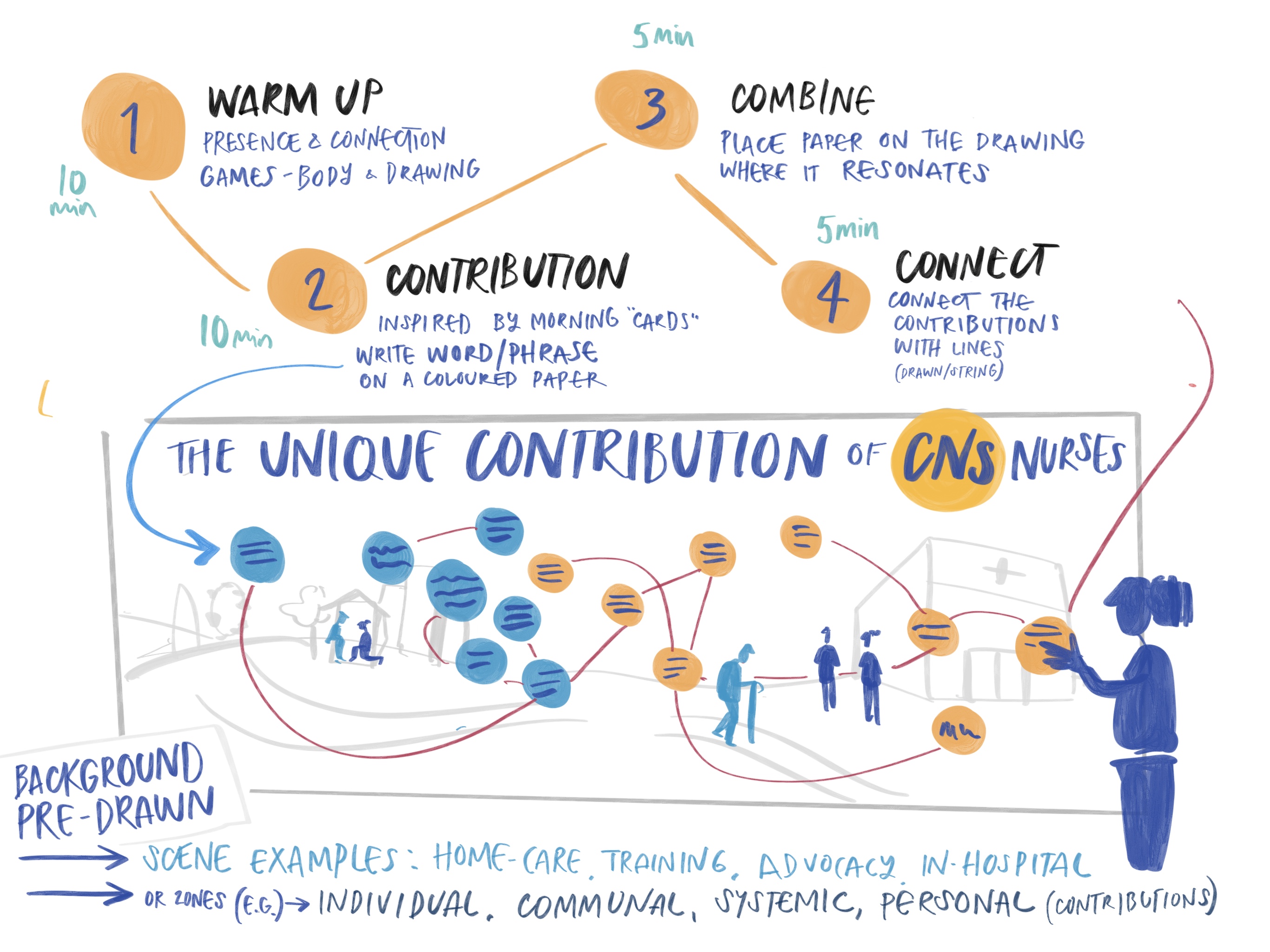 Our journey began with the design phase, where I collaborated closely with Macmillan and NHS teams, drawing upon a rich toolkit spanning graphic facilitation, co-creation methodologies, gestalt principles, art therapy, theatre improvisation, and illustration. This holistic approach aimed to honour both the practical, intellectual and emotional dimensions of the nurses’ experiences.