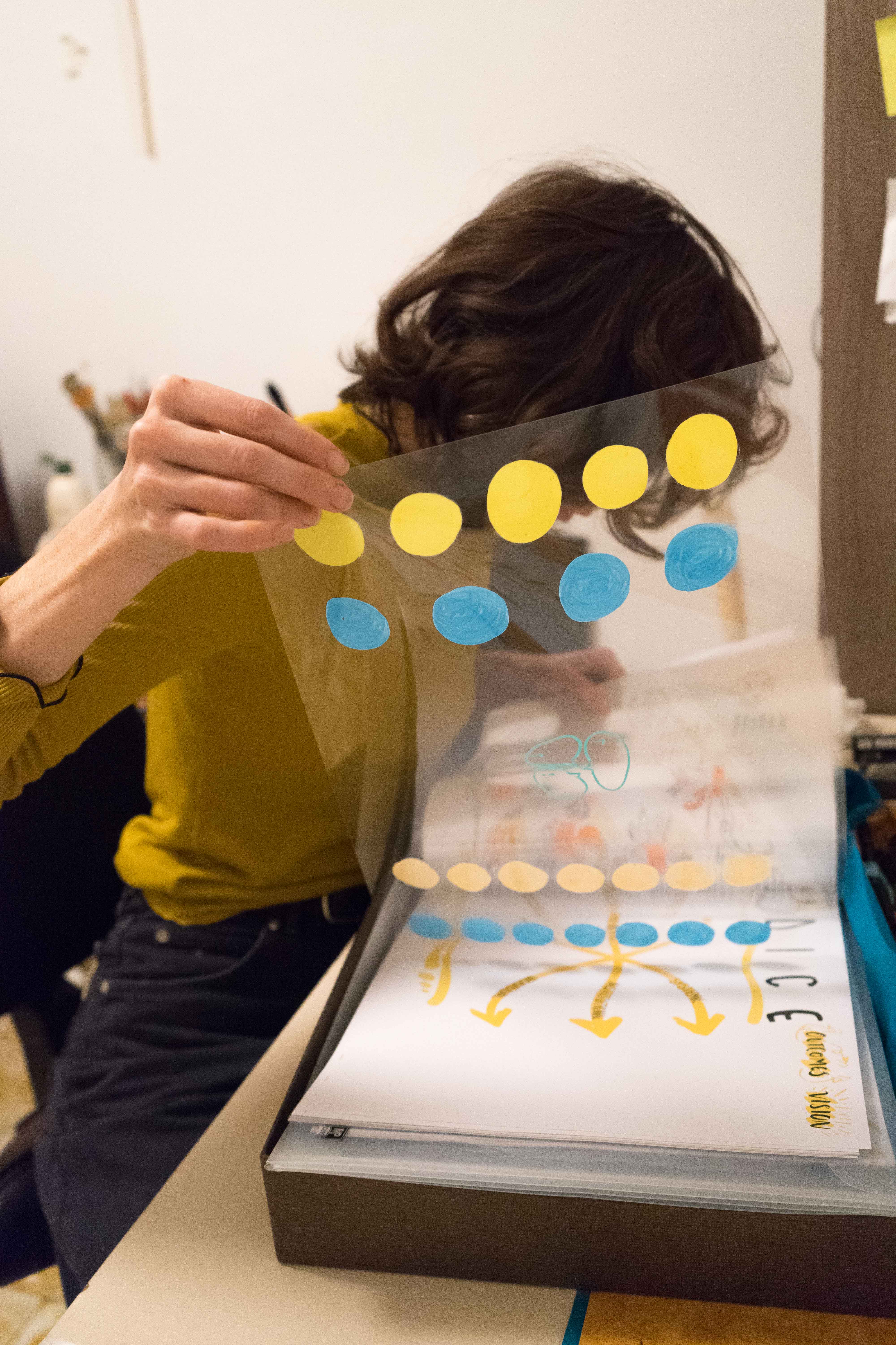 On request I redeveloped the Rich Pictures into a layered, interactive booklet. The hand-coloured booklets were created with individualised content for each recipient and extra transparent layers and pens to allow ideas to keep evolving within a clear, communal structure as the conversation develops.