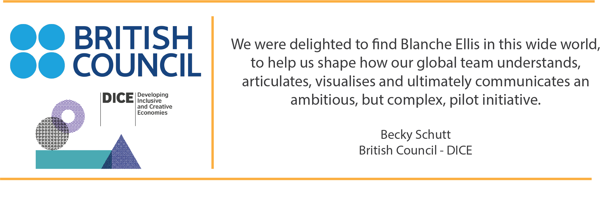 “We were delighted to find Blanche Ellis in this wide world, to help us shape how our global team understands, articulates, visualises and ultimately communicates an ambitious, but complex, pilot initiative. Her open approach to exploration – infused with generosity, curiosity and creativity – combined with her artistic skill resulted in a series of visual ‘working’ documents that we are actively using as a team to test and share our thinking. I couldn’t recommend her enough.”