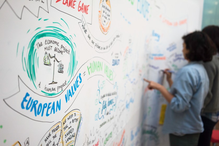It was fantastic to capture this passionate debate for ‘Good Europe’. The talks spanned from finance and economics to migration and climate change. We drew the content onto a large free standing mural in the centre of the event to draw more people into the timely discussion.